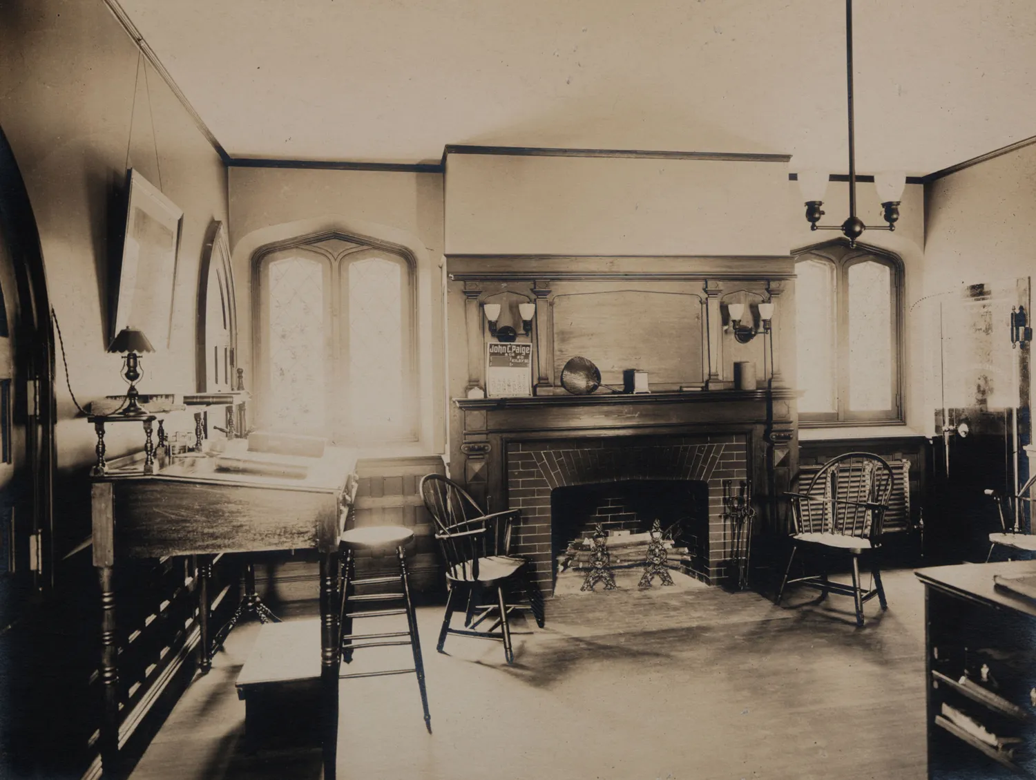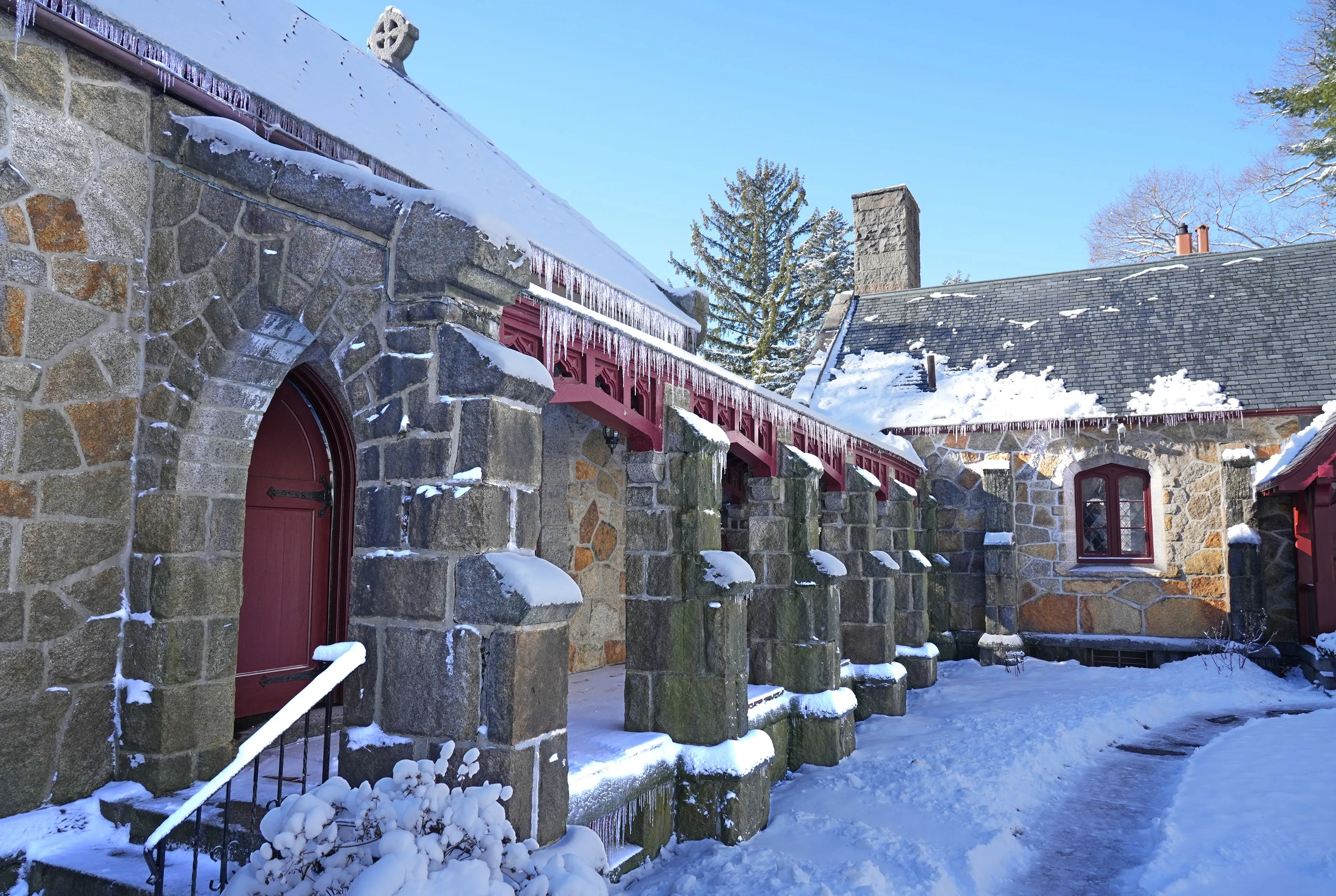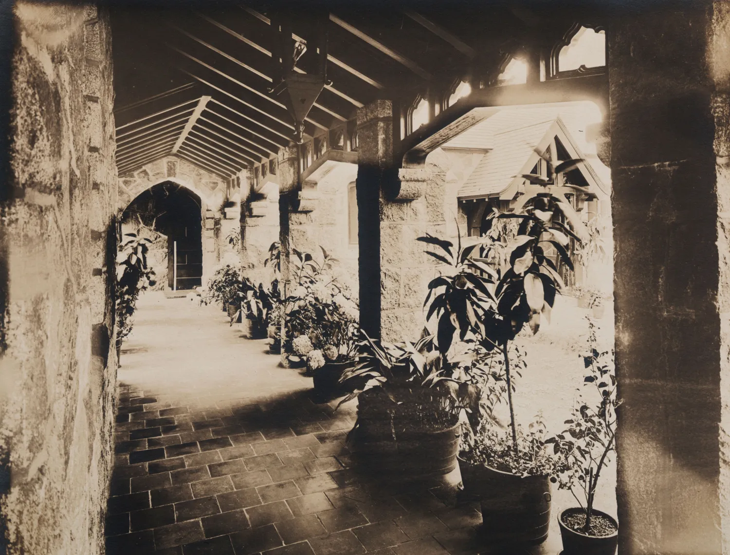 To the east of the chapel lies the administrative complex, connected by a covered stone-columned cloister with a wooden roof. Constructed in the same Gothic Revival style and materials as the chapel, this building houses the main office, a private office, and a brick-and-steel records vault. In the basement is another brick vault for storage. The windows are Gothic and diamond-paned but of clear glass.