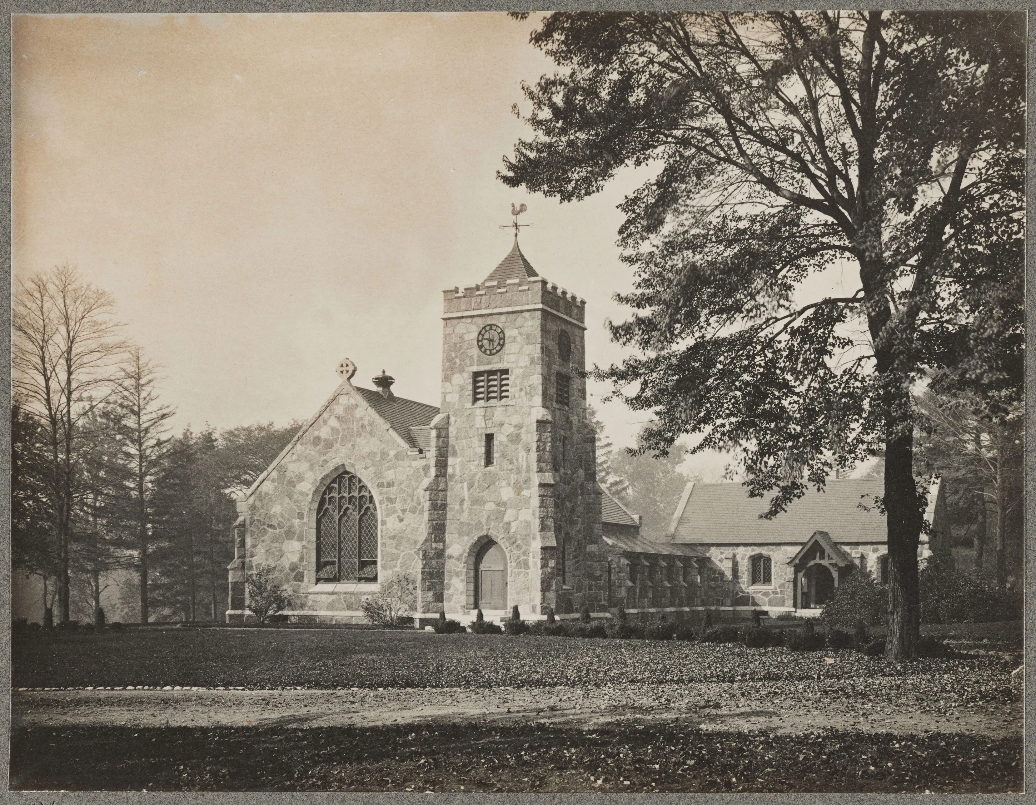 Built of Cape Ann granite, the chapel features stepped wall buttresses, pointed Tudor-arch door and window openings. The building measures 64 feet long by 34 feet wide, with a 65-foot-high off-center bell tower crowned by a weathervane reminiscent of old English missions. The tower bell, cast in 1862 by Henry N. Hooper & Co. of Boston, remains a distinctive feature.