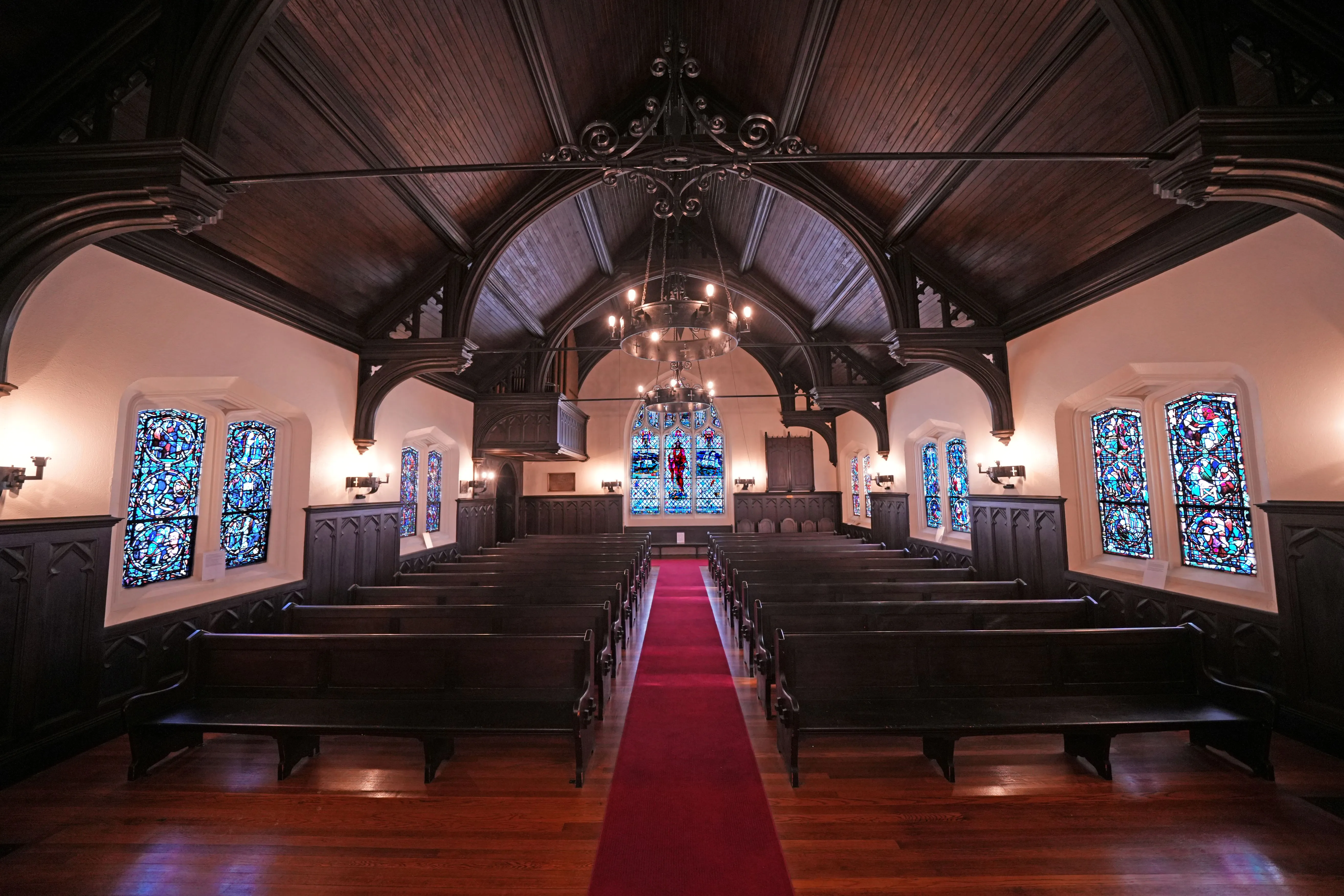 Visitors enter through the massive arched doorway at the base of the tower. Inside, the organ loft overlooks the main entrance, while the vaulted and recessed sanctuary is at the opposite end. The interior features Flemish oak, including the pews, and can accommodate up to 175 people.