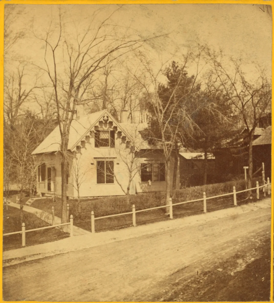 In 1840, a four-room cottage, originally referred to as the Superintendent's House, now called the Caretaker's Cottage, was constructed near the Cemetery’s entrance for the purpose of housing the groundskeeper. The 1 ½-story cottage was built in the Gothic Revival style and included “gingerbread” trim on the gable ends of the roof, and diamond-pane windows with ornamental trim above them. In 1862, a small addition was added to the cottage, with a root cellar below. In 1896, the cottage was substantially enlarged by cemetery workers, increasing its size three times to that of the original cottage. By 2013, some serious structural issues with the 1896 addition were observed, and the Board of Trustees felt that it would be best to remove all but the original four-room structure and rebuild.